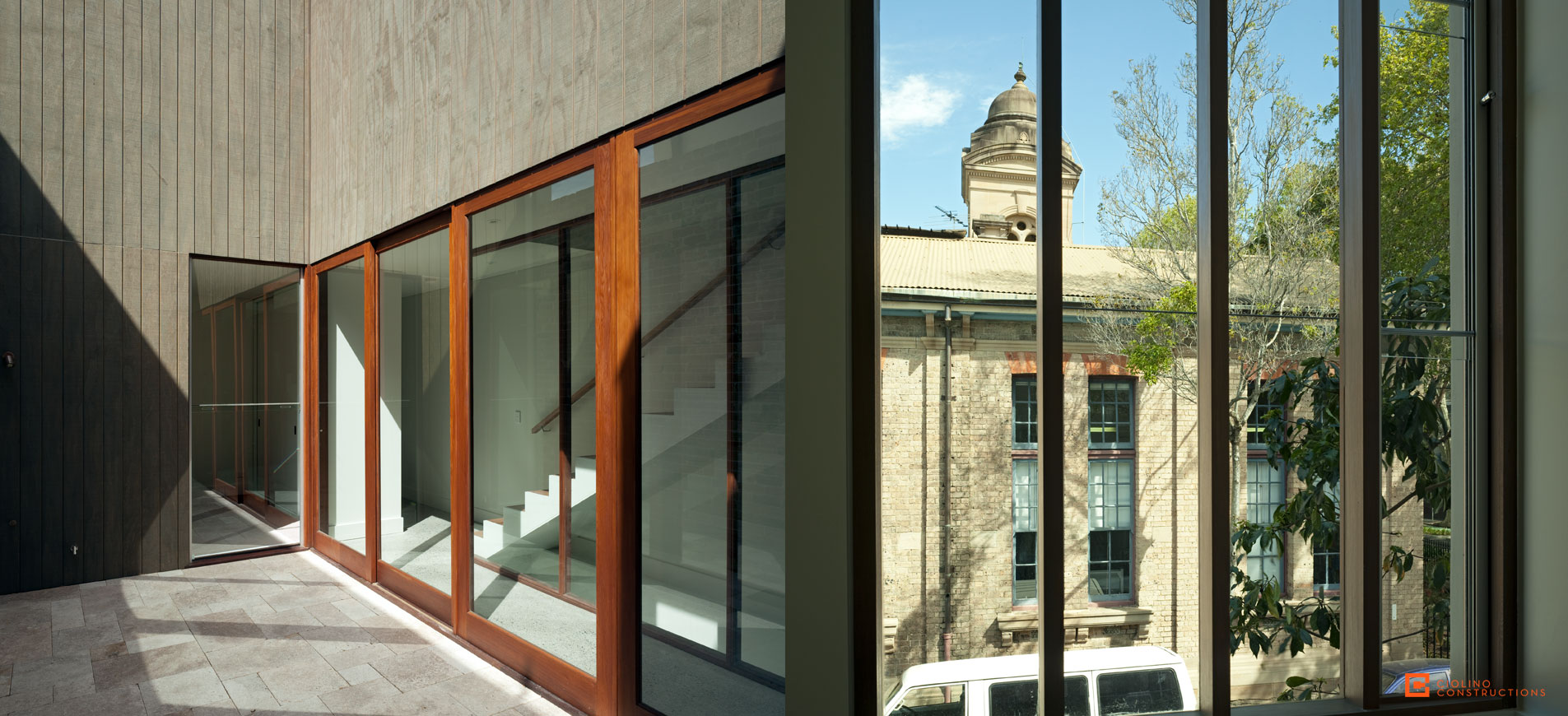 "A modern interpretation of a two storey end terrace house - a corner site with three street faces - with a light filled courtyard which connects to a two-storey studio at the rear. The use of double height spaces in the living areas - Privacy is maintained by the careful placement of slit windows and timber screens."